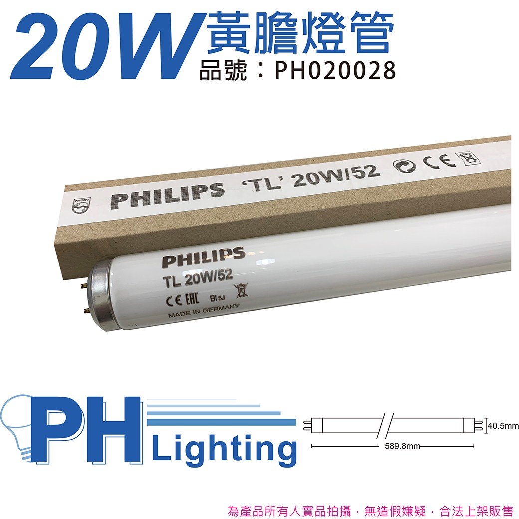 2入 PHILIPS飛利浦TL 20W / 52 藍光T12 黃膽燈管