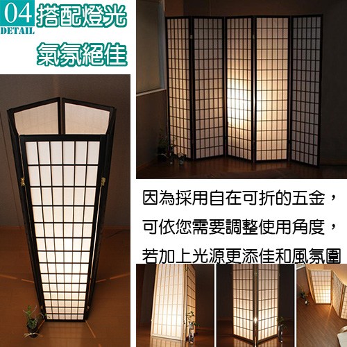 天然木格搭配高質感純白不織布,比起傳統的和紙更不易破,透光性佳可適度採光,輕易營造出中式或和風的風情,可任意折合的特殊五金,想怎麼折都可以,各種角度皆可調整,能夠讓四面屏風依您的需要做成任何造型來擺放,屏風也變成是一種裝飾,輕易提升居家氛圍。不使用的時候,也可以輕鬆折合快速收納,牆角、床底、沙發底下都能收納不占空間。