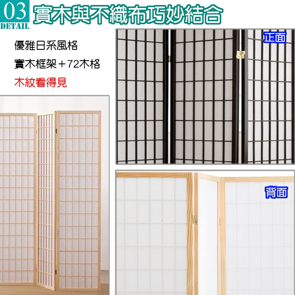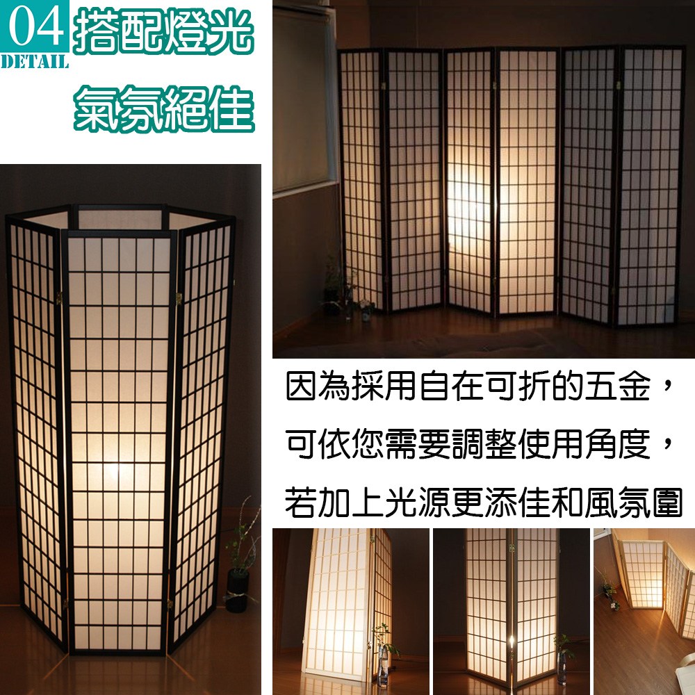 天然木格搭配高質感純白不織布,比起傳統的和紙更不易破,透光性佳可適度採光,輕易營造出中式或和風的風情,可任意折合的特殊五金,想怎麼折都可以,各種角度皆可調整,能夠讓四面屏風依您的需要做成任何造型來擺放,屏風也變成是一種裝飾,輕易提升居家氛圍。不使用的時候,也可以輕鬆折合快速收納,牆角、床底、沙發底下都能收納不占空間。
