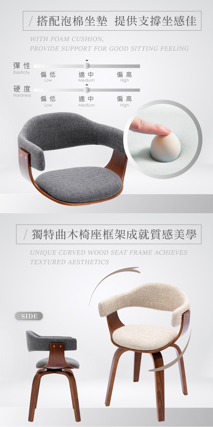 搭配泡棉坐墊、提供支撐坐感佳,獨特曲木椅座框架成就質感美學,椅座可360°旋轉方向隨意彈性佳,