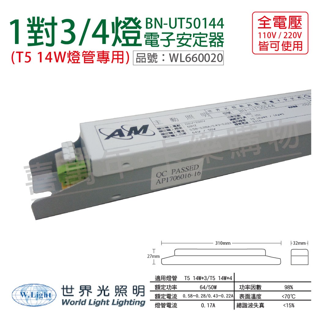 2入 世界光 BM-UFL0401A T8 1燈 全電壓 安定器