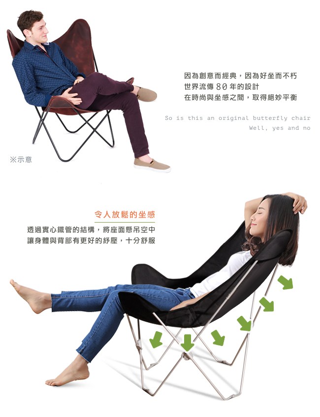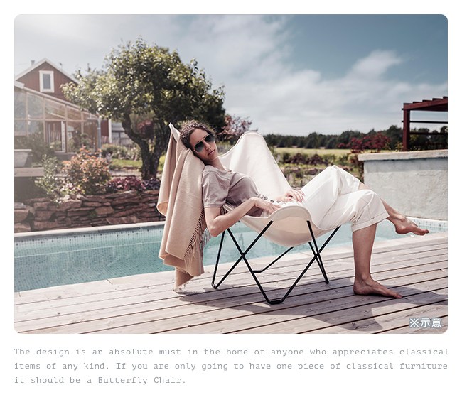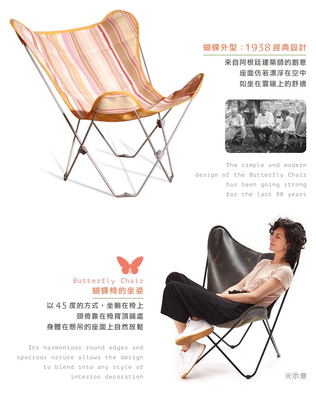 來自 1938 年阿根廷建築師的創意,座面仿若漂浮在空中,如坐在雲端上的舒適。蝴蝶椅的坐姿以 45 度的方式,坐躺在椅上,頭倚靠在椅背頂端處,身體在懸吊的座面上自然放鬆。因為創意而經典,因為好坐而不朽,世界流傳 80 年的設計,在時尚與坐感之間,取得絕妙平衡。
