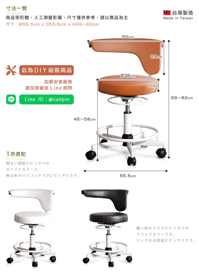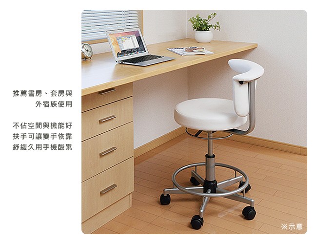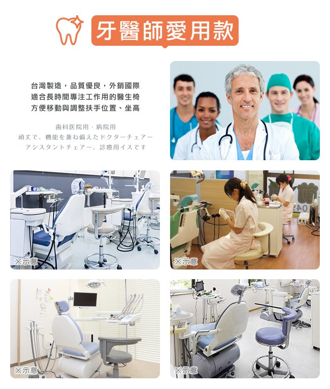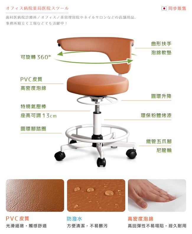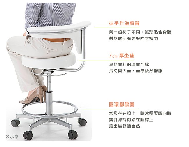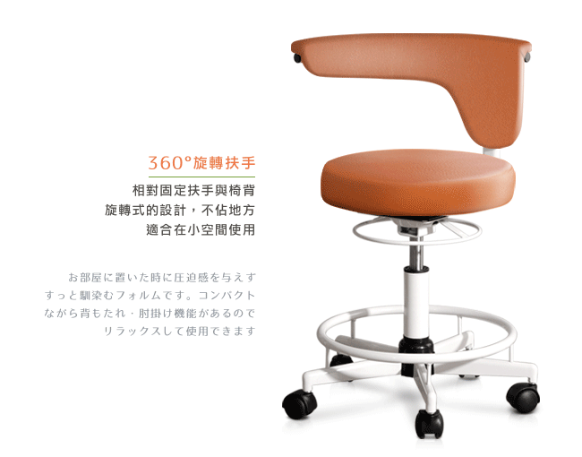 台灣製造,日本同步發售,特別為醫生在專業的環境下所設計,適合長時間專注工作。360 度旋轉扶手,相對於固定扶手與椅背,旋轉式的設計不佔地方,適合在小空間使用。弧形的「側扶手」,讓手臂輕鬆擺放,泡綿軟墊提升舒適性。「前扶手」讓雙手可依靠,在長時間專注的情況下,紓緩肌肉的疲勞。當扶手作為椅背時,與一般椅子不同,弧形貼合身體,對於腰部有更好的支撐力。