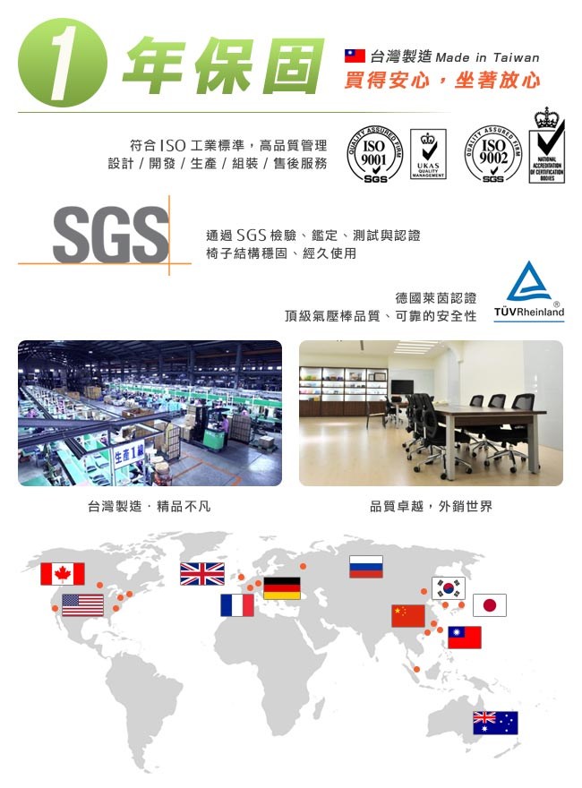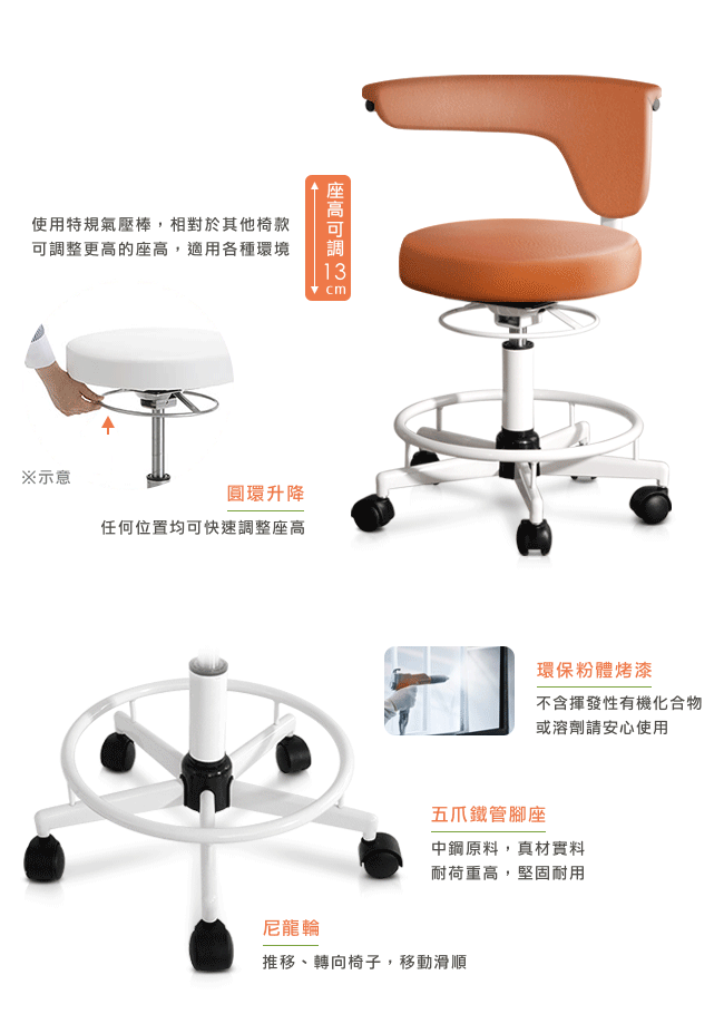 「圓環升降」在任何位置均可快速調整座高。當您坐在椅上時,時常需要轉向的話,「圓環腳踏圈」讓雙腳都能夠踏在圓桿上,坐姿舒適依然。使用特規氣壓棒,座高升降 13cm。相對於其他椅款,可調整更高的座高,適用各種環境。五爪鐵管腳座,中鋼原料,真材實料,耐荷重高,堅固耐用。尼龍輪推移、轉向椅子,移動順暢。
