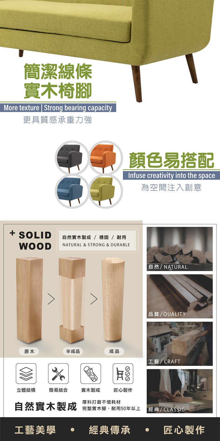 厚實的扶手設計讓手部輕鬆倚靠,雙層坐墊、高密度泡棉坐感舒適,搭配簡潔線條實木椅腳承重力強,