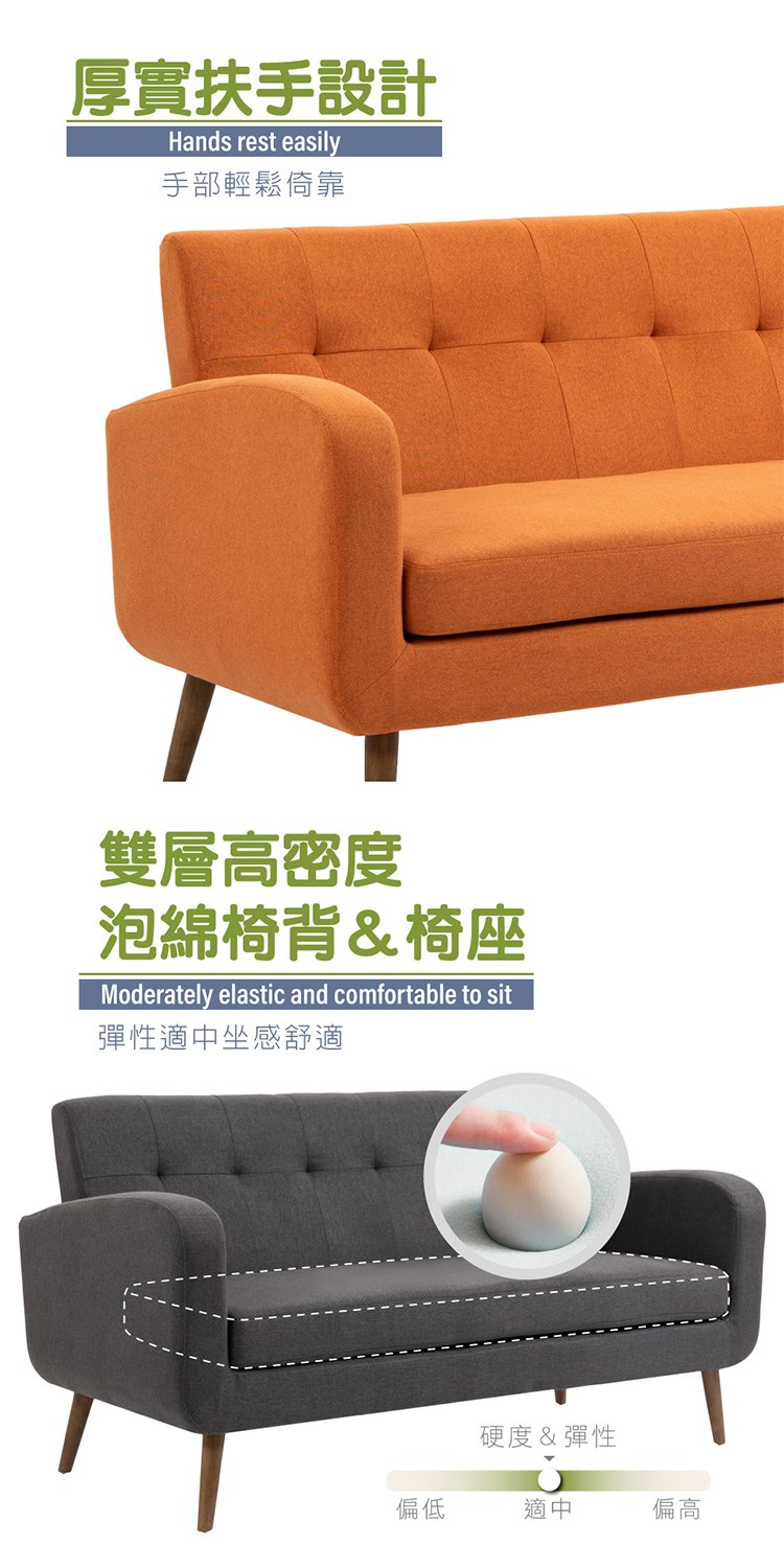 厚實的扶手設計讓手部輕鬆倚靠,雙層坐墊、高密度泡棉坐感舒適,搭配簡潔線條實木椅腳承重力強,