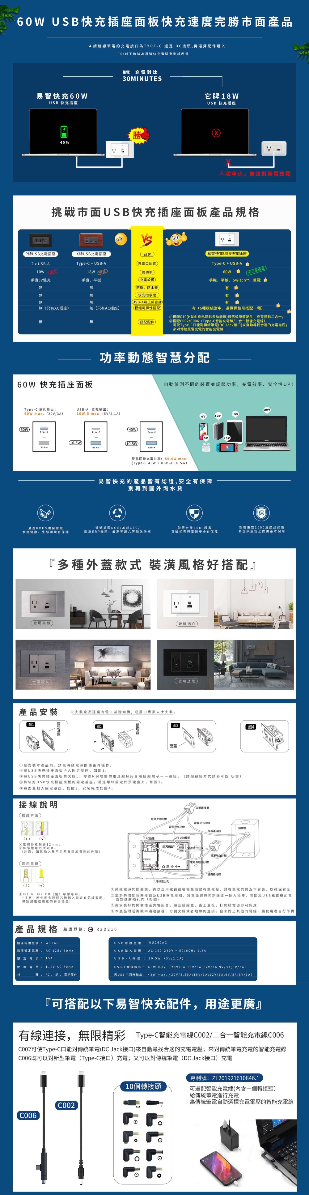 【易智快充】30W USB快充插座面板(AC+USB+LED開關)玻璃透白