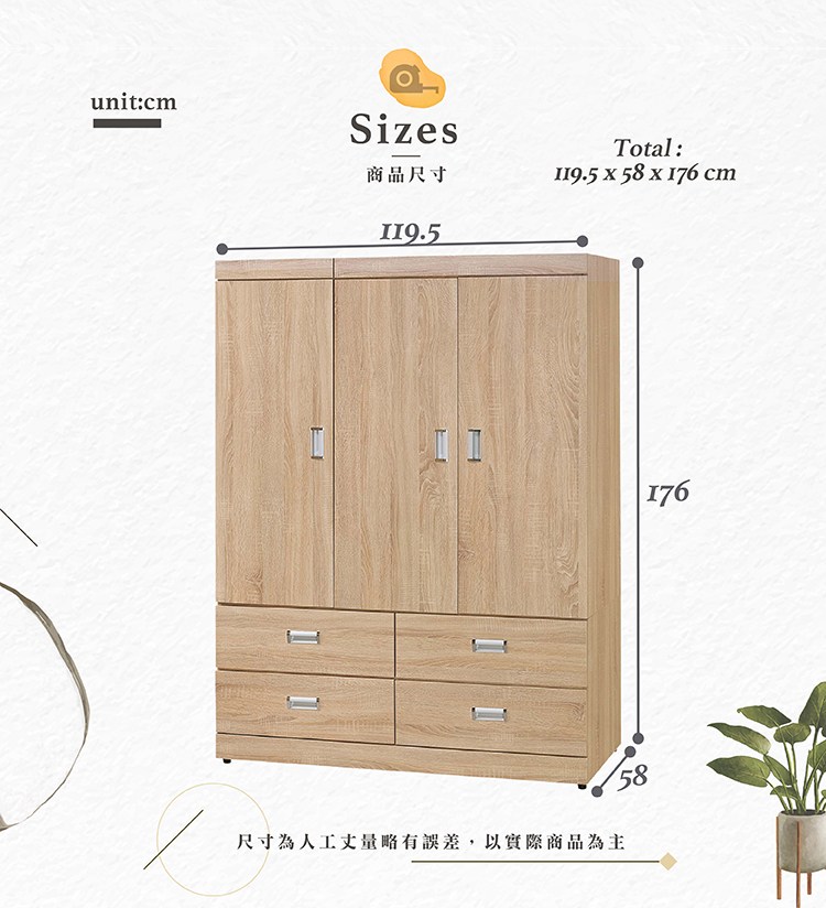 【綠活居】斯里蘭 現代3.9尺三門四抽衣櫃/收納櫃(二色可選)-116x56x176cm免組