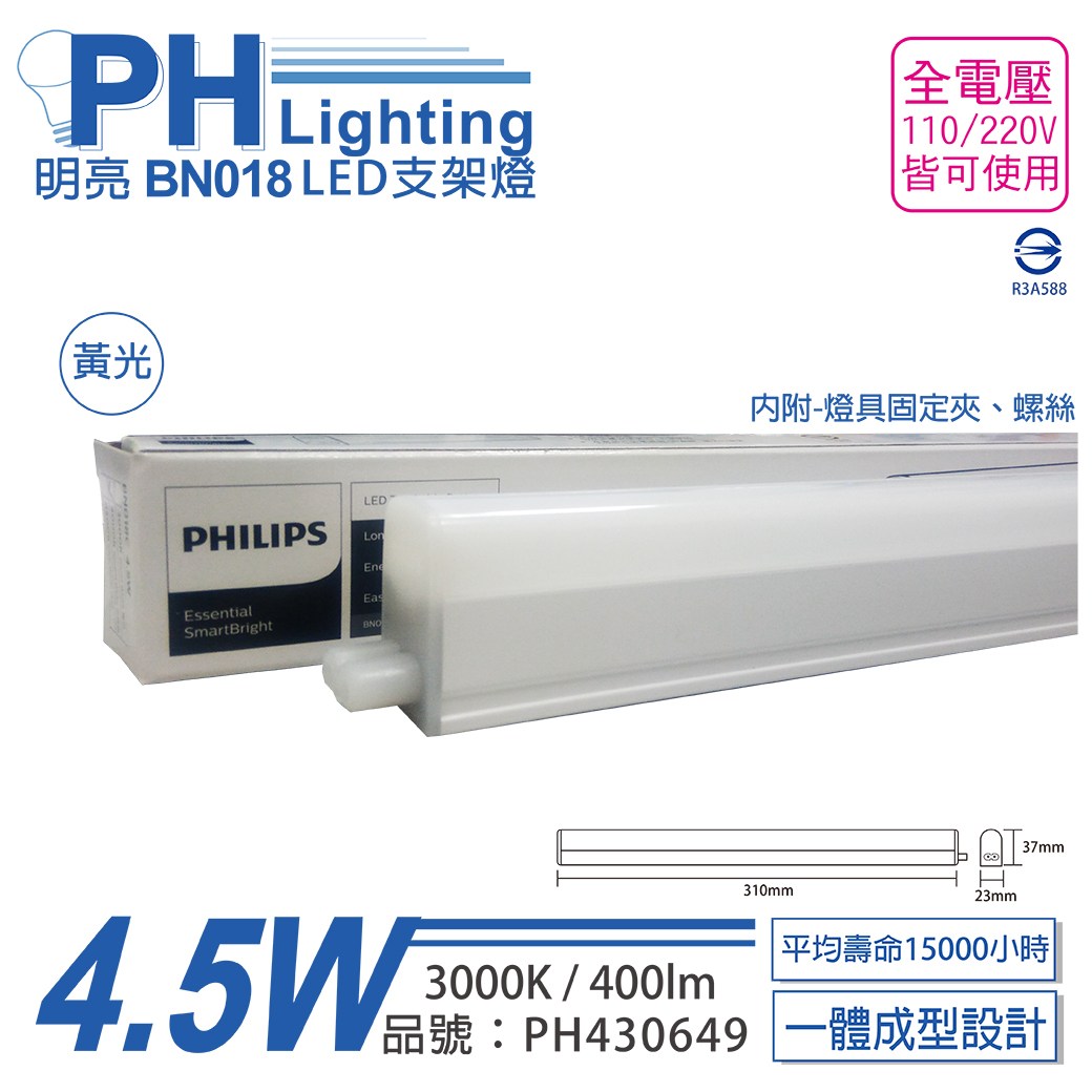 3入 贈線 PHILIPS飛利浦 BN018 LED支架燈 4.5W 黃光 1尺