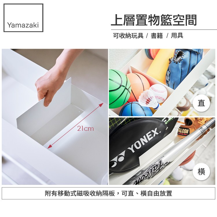 上層置物籃可收納玩具、書籍等,並附有移動式磁吸隔板,