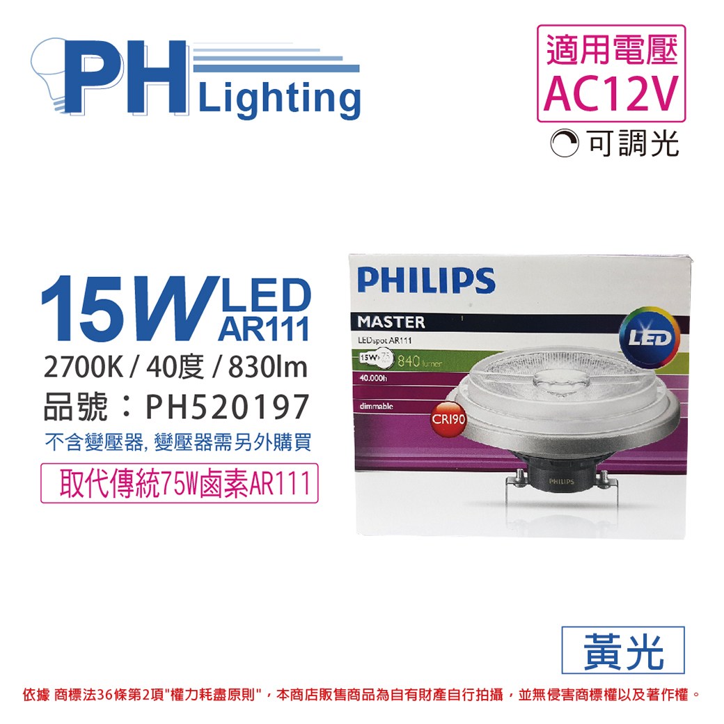 2入 PHILIPS飛利浦 LED 20W 黃光 12V AR111 40度 可調光 燈泡