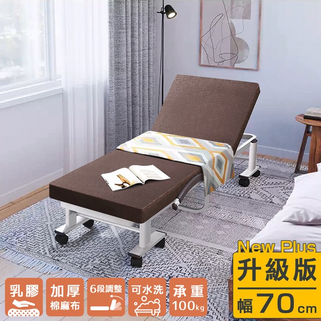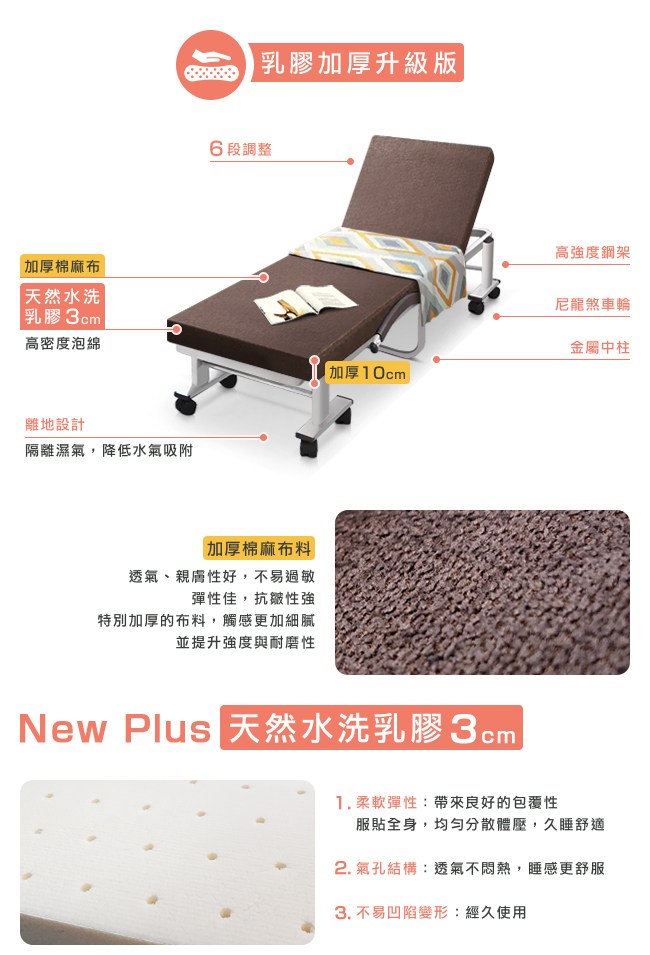 New Plus 加厚升級:天然水洗乳膠 3cm,柔軟彈性帶來良好的包覆性,服貼全身,均勻分散體壓,久睡舒適。氣孔結構,透氣不悶熱,睡感更舒服。不易凹陷變形,經久使用。加厚棉麻布,透氣、親膚性好,不易過敏。特別加厚的布料,觸感更加細膩,並提升強度與耐磨性。六段椅背快速調整,握住床墊背部,向上扳即可選擇椅背傾仰度。椅背扳過 90 度後,自然回檔放平,簡單變成一張床舖。安全插銷與防夾手設計,在折疊與展開床面時,操作過程更加安全。折疊後寬幅 33cm,方便移動,不佔地方,可收納於隙縫角落。橫向粗管床架、加密鋼網、加厚鍍鋅管,承重強,結構安穩,經久耐用。可拆洗布套,定期清潔床套,避免過敏原孳生。贈送小方枕 1 個(顏色隨機)與防塵套 1 個,折疊後可避免床墊沾染灰塵,保持乾淨。
