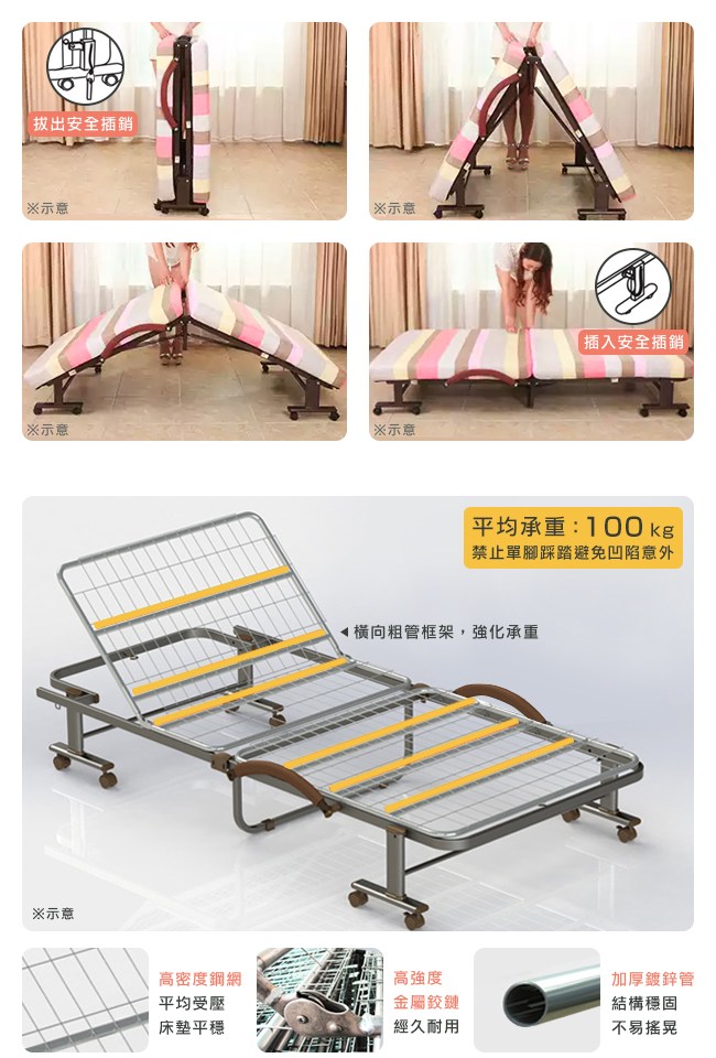 ・展開床架後,務必插入安全插銷,避免床面翻覆。