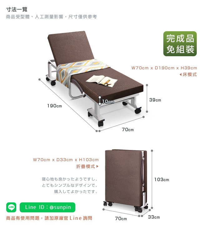 外宿族/工作室首選,可折疊收納騰出空間,讓部屋不會有擁擠感。推薦陪護/值班使用,快速展開折疊床,護理人員能好好休息,也方便就近照顧家人。有朋至遠方來,來客加床,睡感舒適,不用時折疊起來不佔用空間。