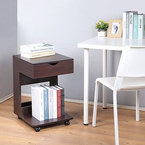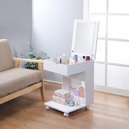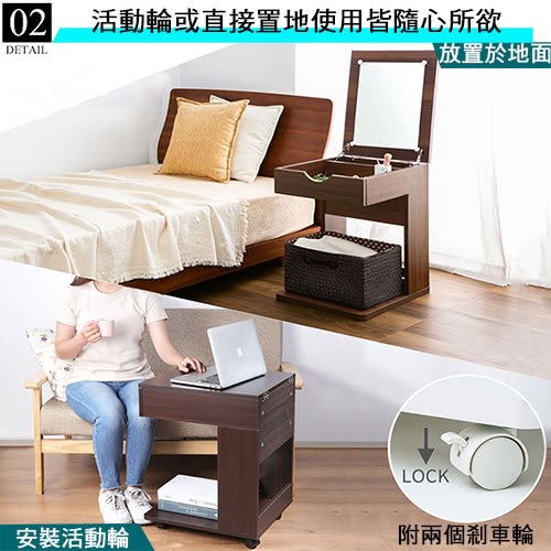 兩種使用方式可依您的需求 裝上活動輪或者 直接置地使用, ㄈ字形的獨特設計讓底板可以直接進去床底或沙發底下,當您在床上或沙發上也能身體靠近地使用本商品,雖然原始的設計是 化妝櫃但也十分適合做為 床邊桌或 沙發邊桌。