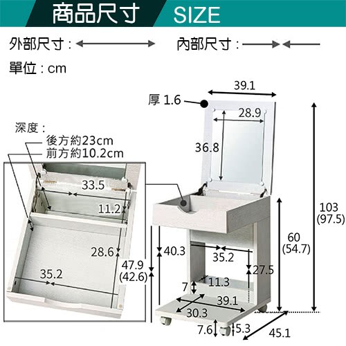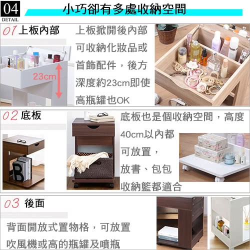 上板 掀開來內部有 一深一淺的收納空間,想收納高的瓶罐也不怕; 底板也是一個高度有40cm的置物板; 後方更設計了置物格讓日式的多機能設計完全展現,化妝櫃、桌邊櫃、邊桌都很適合喔,貼心 免組裝完成品出貨,收到商品不必大費周章組裝開箱即可使用,適合怕麻煩的小資族群。