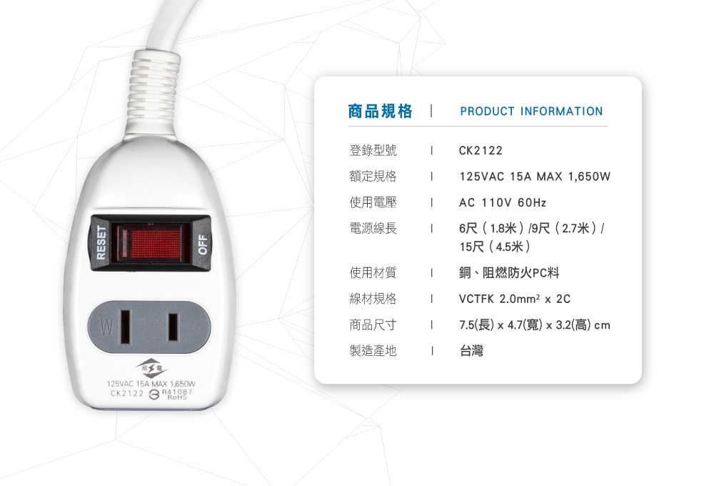【威電】CK-2122 2孔1開2座 延長線 4尺/6尺/9尺(180度任轉插頭 過載斷電 電源線組)