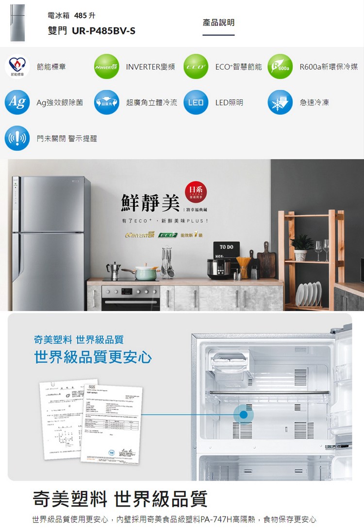 CHIMEI奇美485公升變頻一級雙門電冰箱 UR-P485BV-S~含拆箱定位+舊機回收