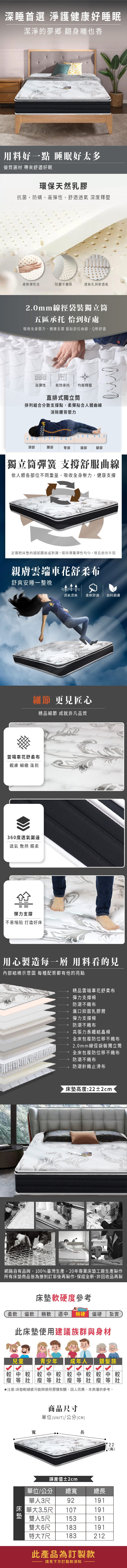 MG抗菌竹碳紗乳膠防潑水蜂巢獨立筒床墊-雙人五尺
