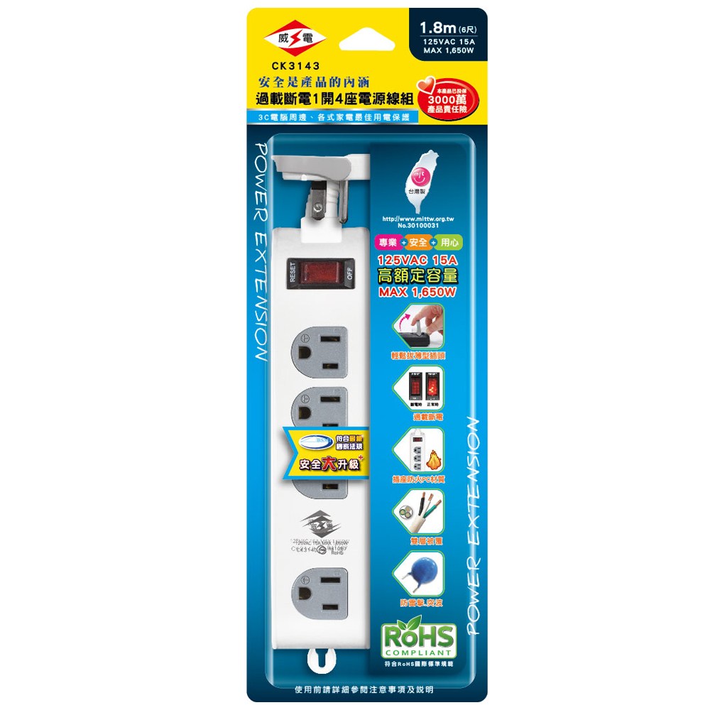 威電牌過載斷電延長線/CK3141/3孔4座1切/9尺/條