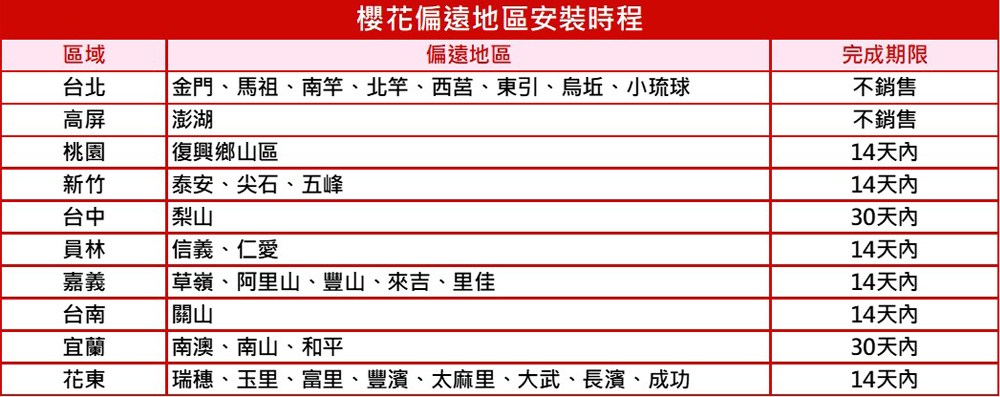 ◎遍遠地區(如下表,標示天數為工作天)需配合櫻花定期服務時間(櫻花安裝人員以電話約排)