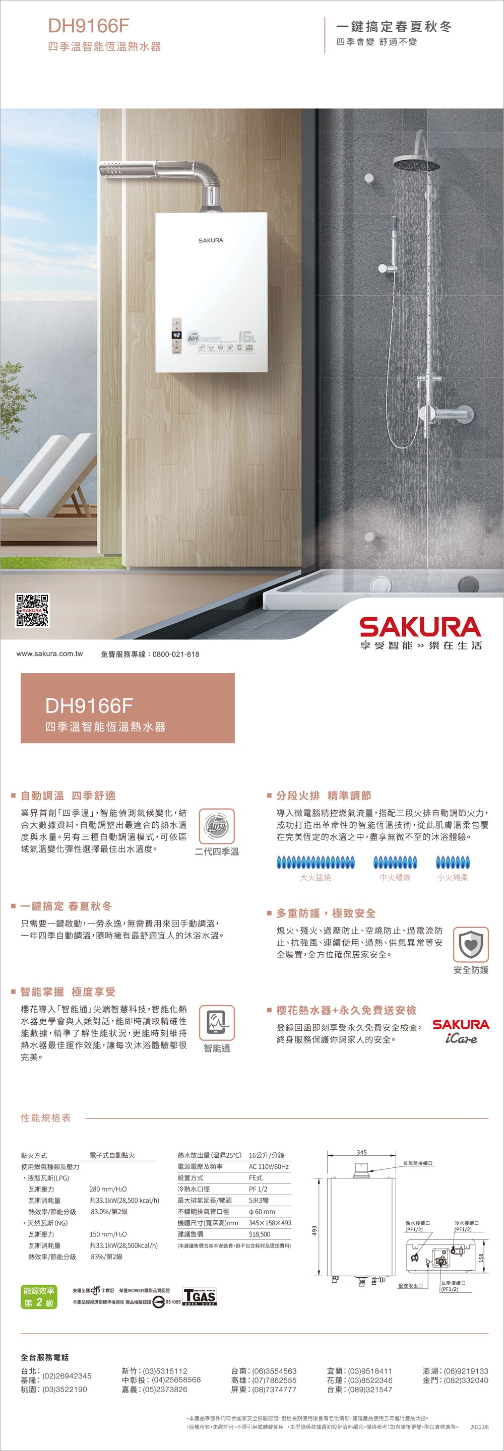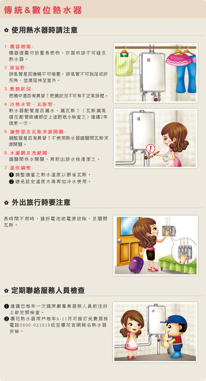 2, 為避免一氧化碳中毐,熱水器主體與配件安裝需符合國家相關法令,詳情請參考【消防法】第15條之1【燃氣熱水器及其配管安裝標準】規定