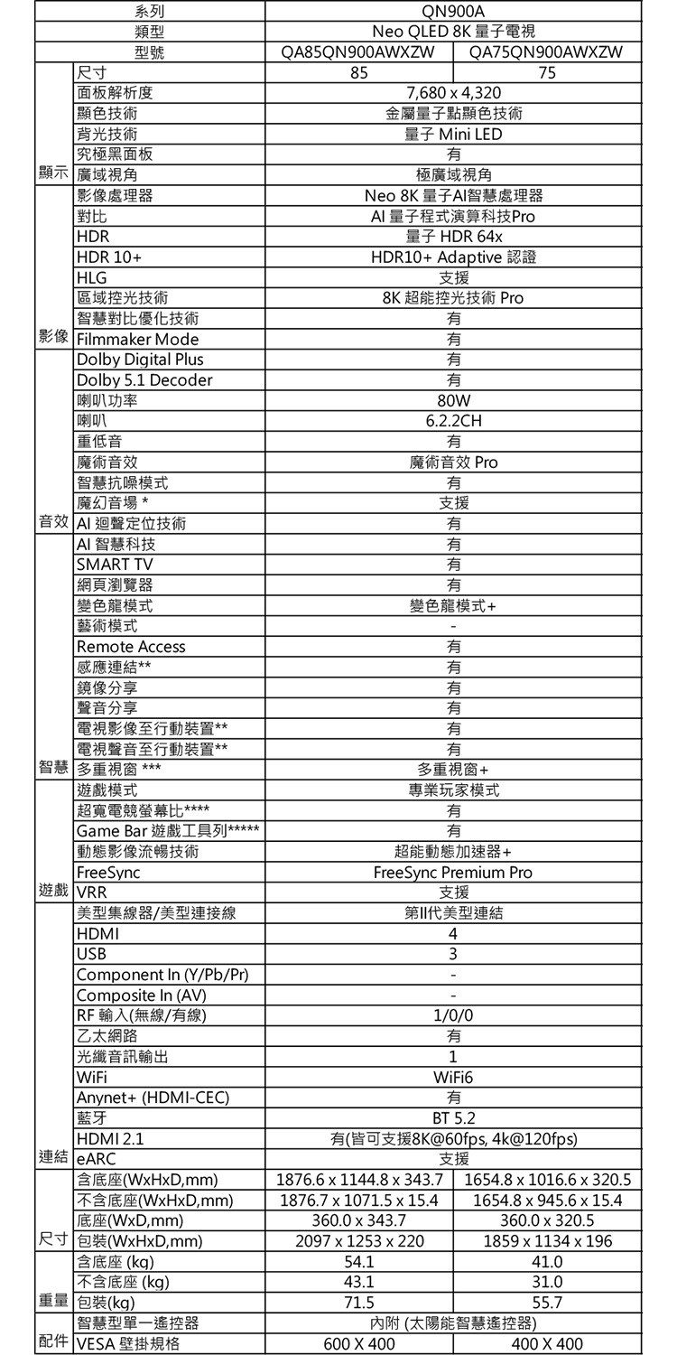 三星 SAMSUNG 75型8K HDR智慧連網 NEOQLED量子電視 QA75QN900AWXZW 75QN900A