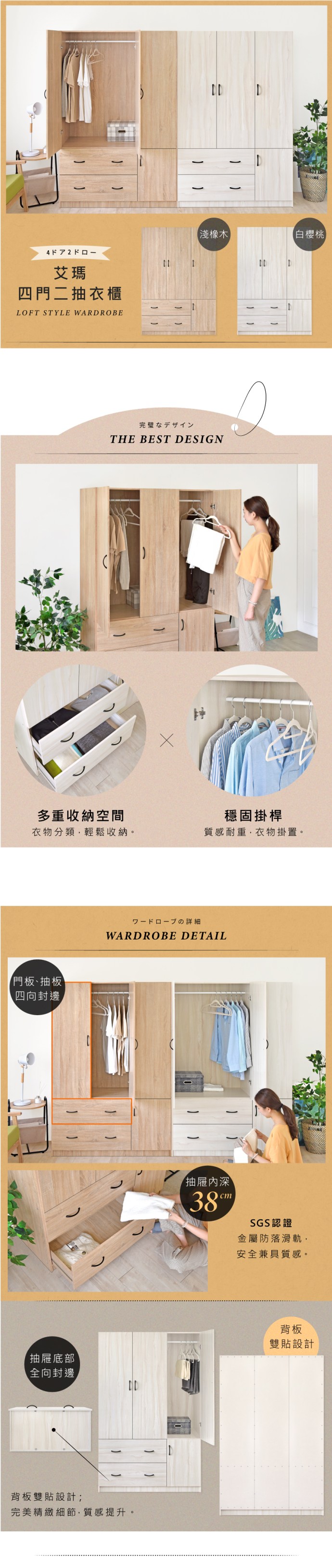 《HOPMA》美背和風四門二抽衣櫃 台灣製造 衣櫥 抽屜櫃 衣物收納櫃-拼版柚木