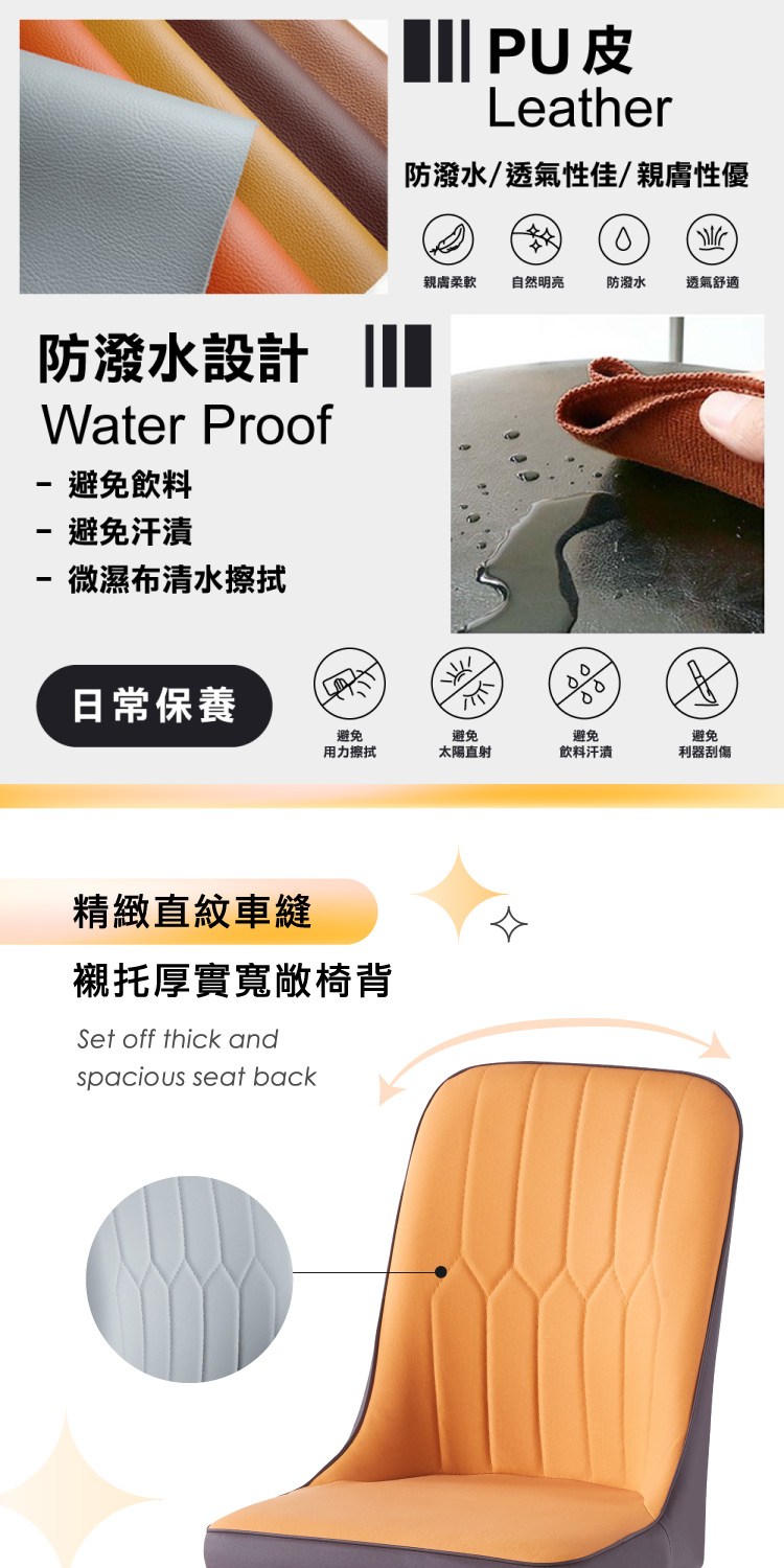 台灣與歐美同步販售、美規設計,防潑水透氣PU皮座面,易於清潔,精緻直紋車縫襯托厚實寬敞椅背,