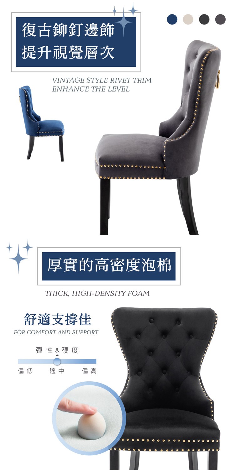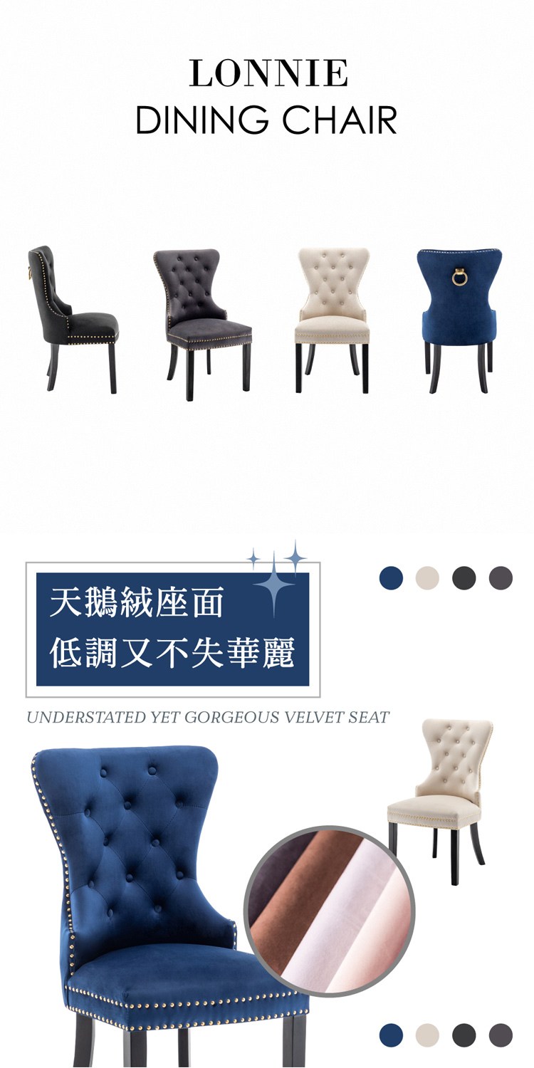 [E-home]Lonnie朗尼絨布拉扣鉚釘木質腳休閒餐椅,英式維多利亞古典風格典雅浪漫,時尚輕奢氛圍。