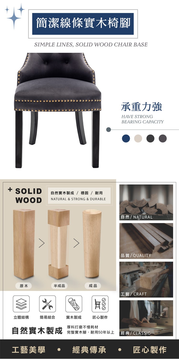 搭配簡潔線條實木椅腳承重力強,易於搭配的顏色為空間注入創意,簡單自在又蘊含古典的獨特品味。