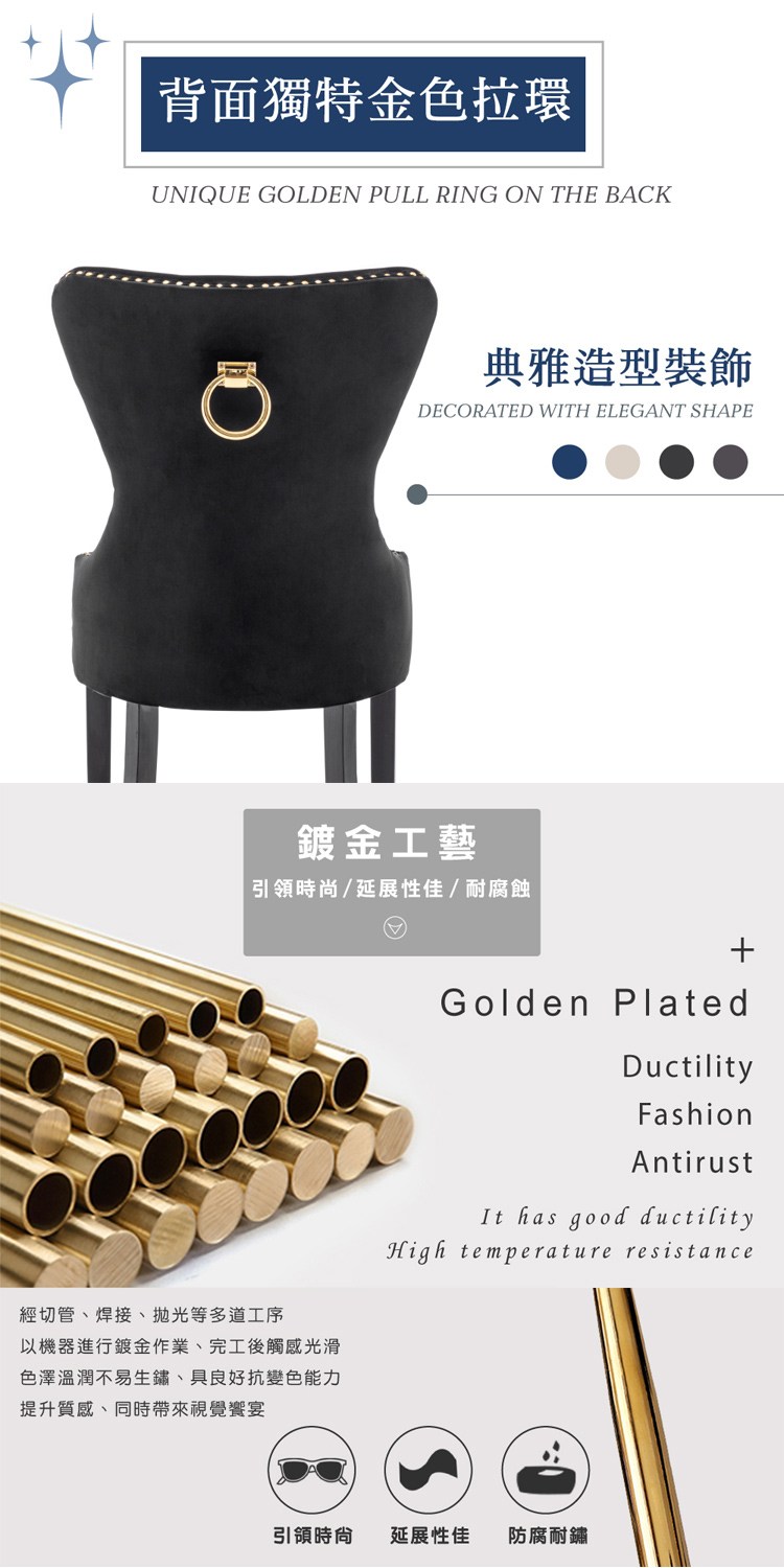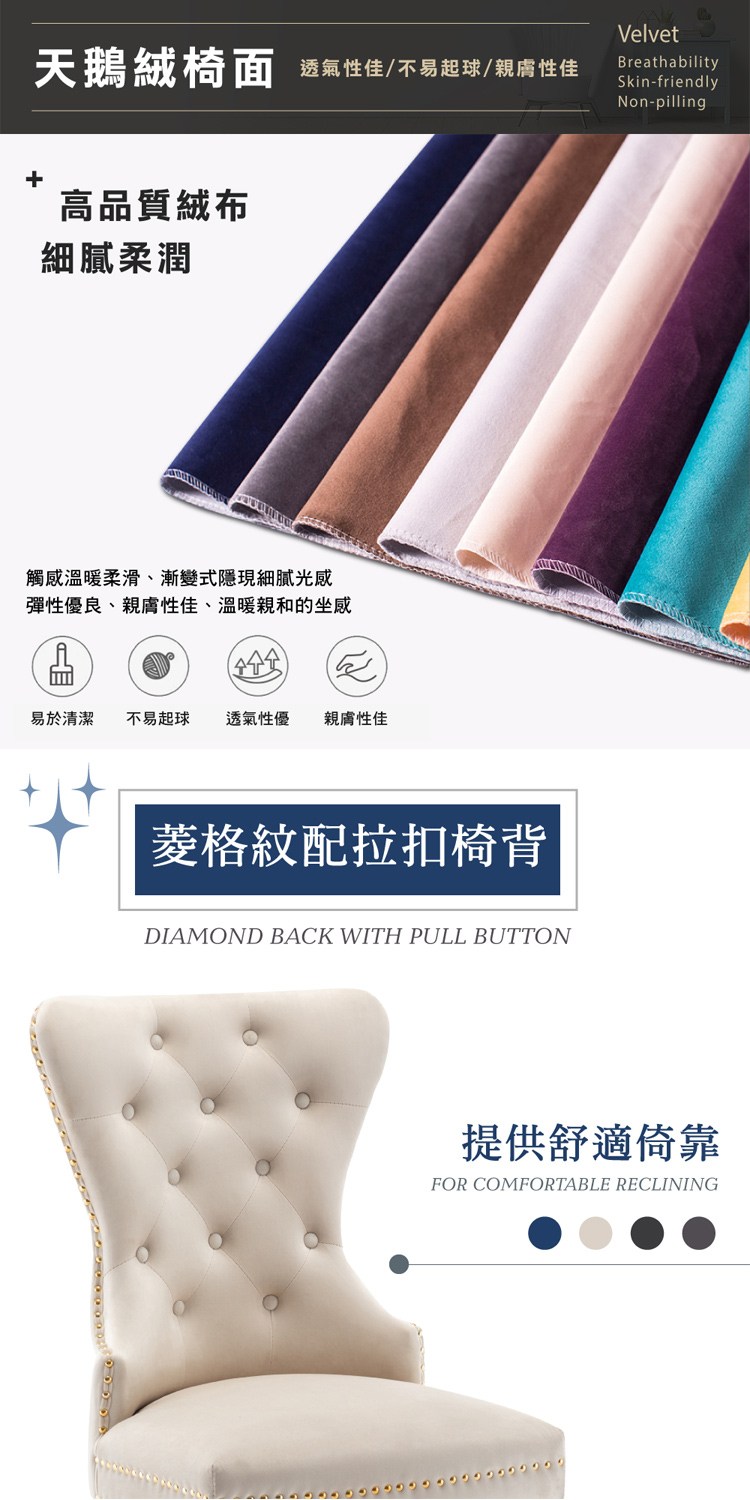 台灣與歐美同步販售、美規設計,低調而又不失華麗的天鵝絨座面,菱格紋配拉扣椅背提供舒適倚靠,