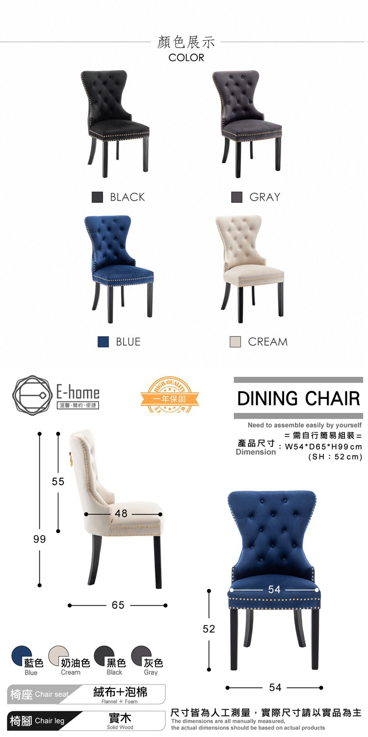 [E-home]Lonnie朗尼絨布拉扣鉚釘木質腳休閒餐椅,英式維多利亞古典風格典雅浪漫,時尚輕奢氛圍。