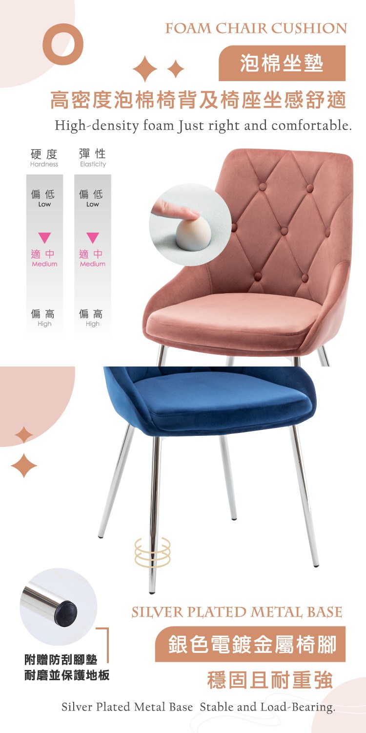 高密度泡棉椅背及椅座坐感舒適,銀色電鍍金屬椅腳、穩固又耐用,附贈防刮腳墊、耐磨並保護地板,