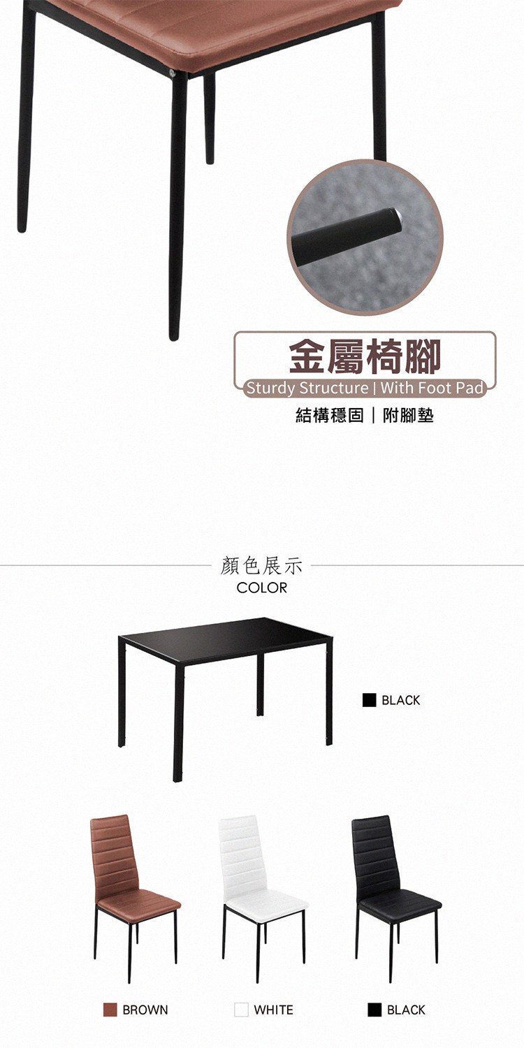 防潑水玻璃桌面易於擦拭好清潔,金屬黑漆桌架附腳墊,結構穩固,PU皮座面餐椅,觸感佳容易擦拭,