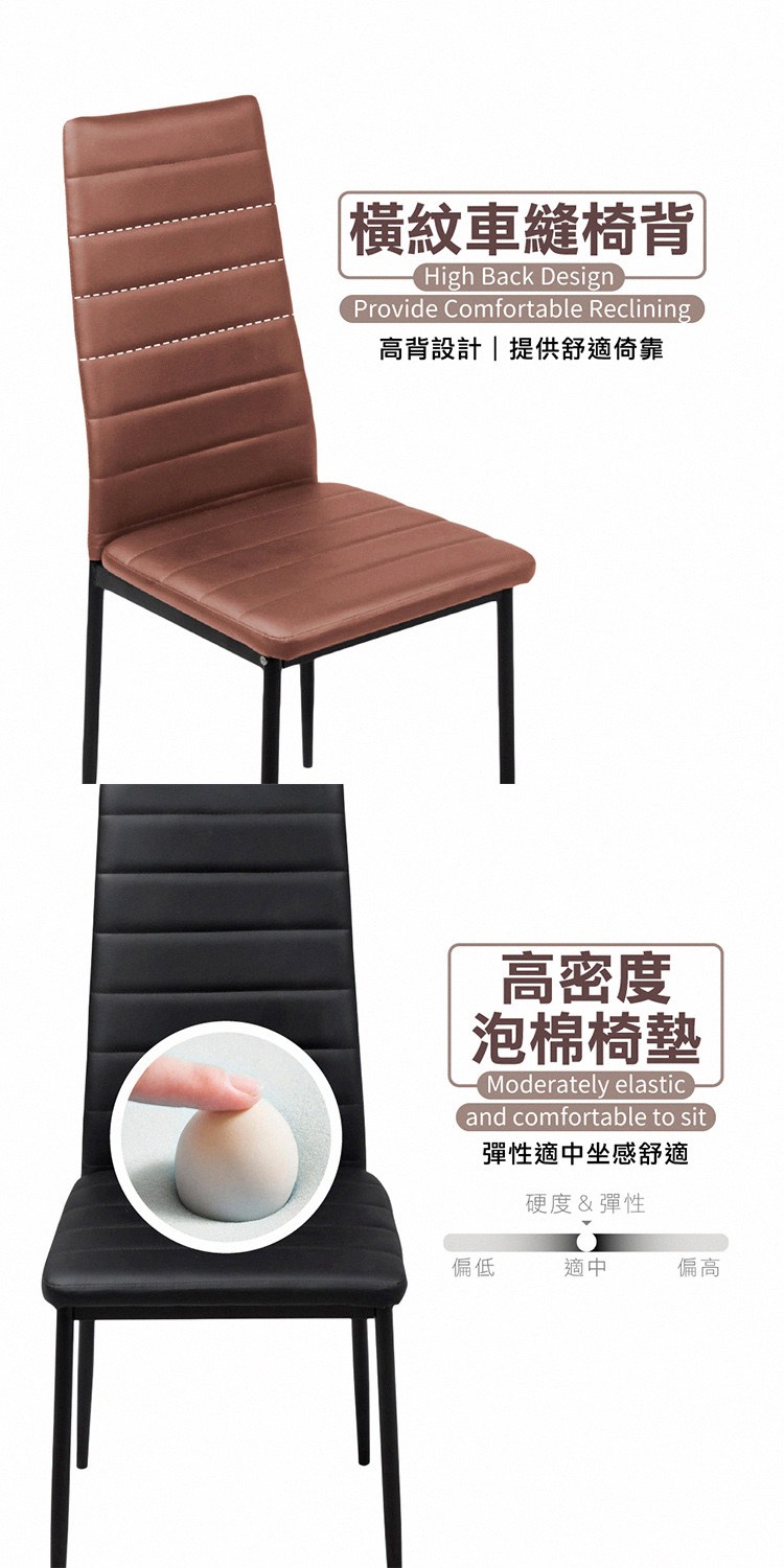 橫紋車縫高背設計提供舒適倚靠,搭配高密度泡棉,坐感彈性支撐,金屬椅腳附贈防刮腳墊保護地板,