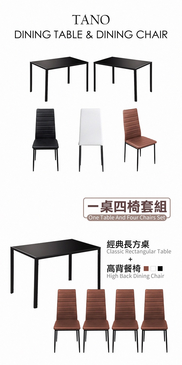 台灣與歐美同步販售、美規設計,經典長方桌與高背餐椅完美組合,餐桌面採6mm安全防裂鋼化玻璃,