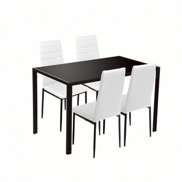 防潑水玻璃桌面易於擦拭好清潔,金屬黑漆桌架附腳墊,結構穩固,PU皮座面餐椅,觸感佳容易擦拭,