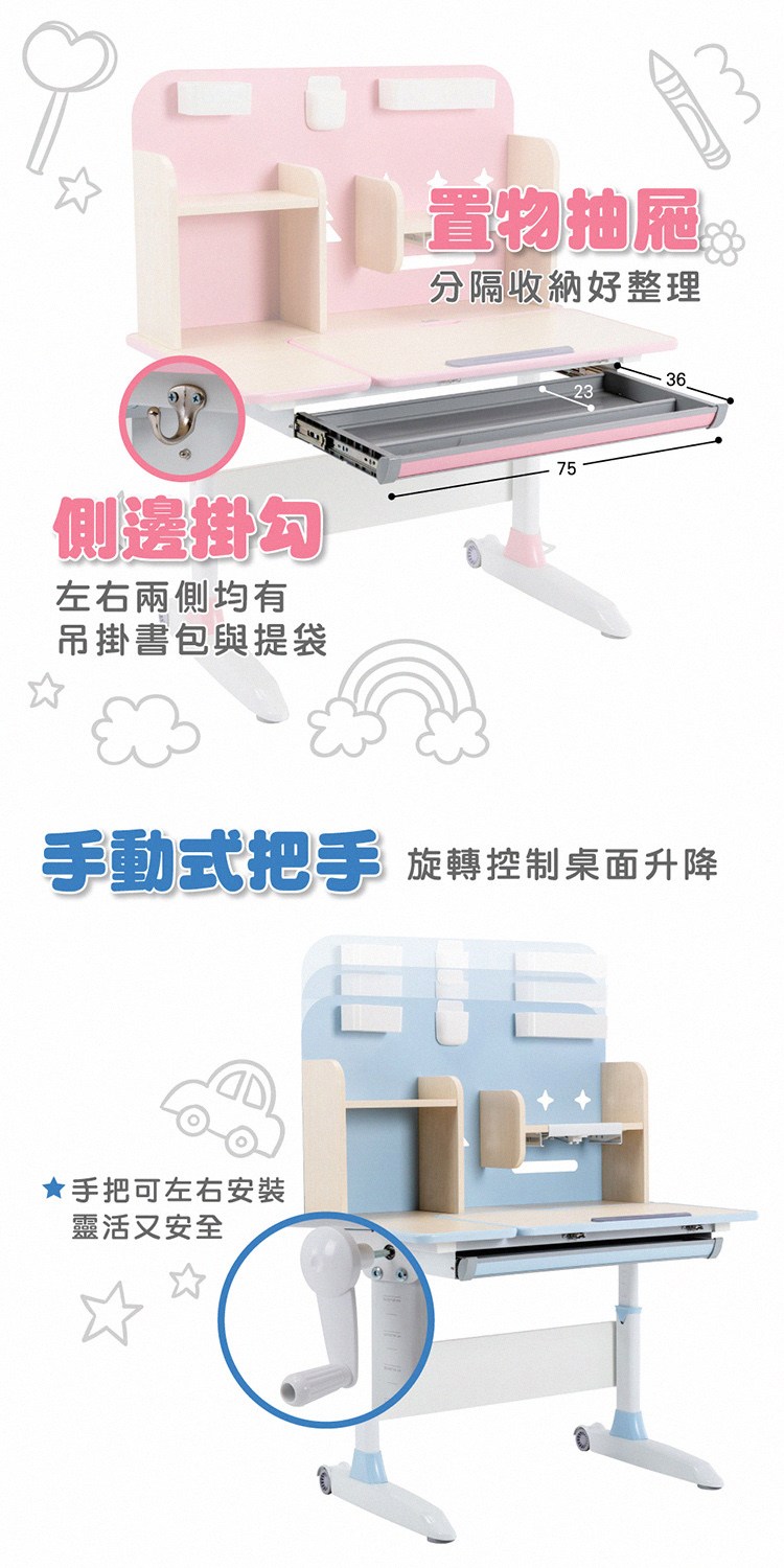 桌邊二側掛勾可吊掛書包與提袋,手動式把手,旋轉控制桌面升降,手把位置可左右安裝靈活又安全,