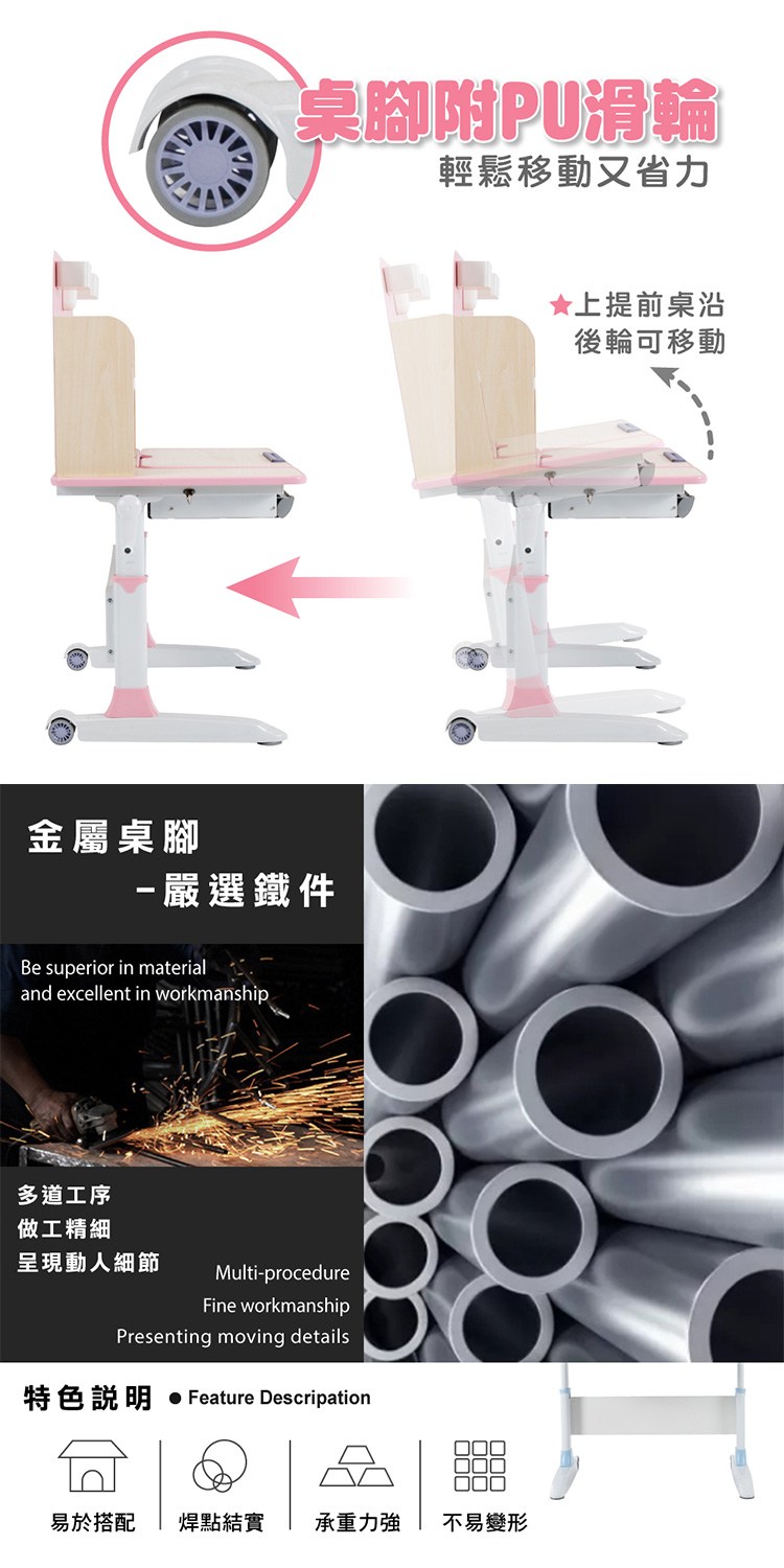 桌腳附有PU滑輪輕鬆移動又省力,讓學齡的孩子在樂趣中專注學習,提早培養專注力,調整正確坐姿。