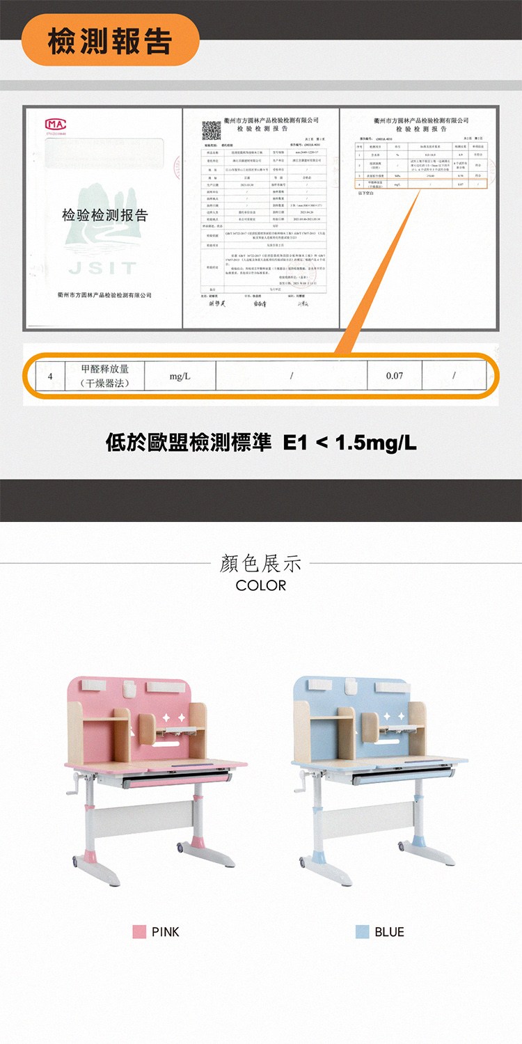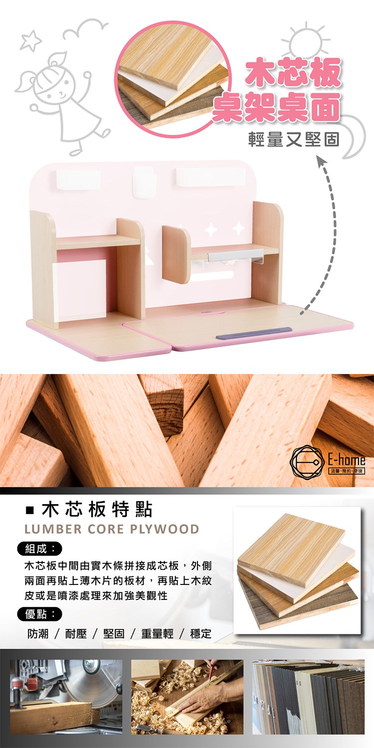 桌架及桌面為輕量堅固之木芯板,左側獨立桌面空間可供家長伴讀,防夾手傾斜桌面最大角度可到70°,