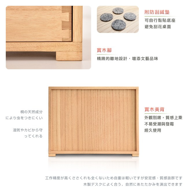 總是將小物全數扔在書桌抽屜裡,每次都要東翻西找嗎?袖珍博物館實木收納櫃系列,將飾品、印鑑、存摺簿、文具、茶包等日用品妥善收好,方便拿取。一個收納的小改變,除了讓桌面變得整齊外,做事情也將更有效率。使用千年古法・鳩尾榫接是最強固的接合法之一,能抗拉力、推力,堅固耐用。經典風格的復古銅製把手,簡單卻令人印象深刻,好握好開,順暢拉開抽屜。可放入標籤,方便分類。實木美背,外觀別緻,質感上乘,不易受潮與發霉,經久使用。附防刮軟墊避免刮花桌面,且不易滑動。
