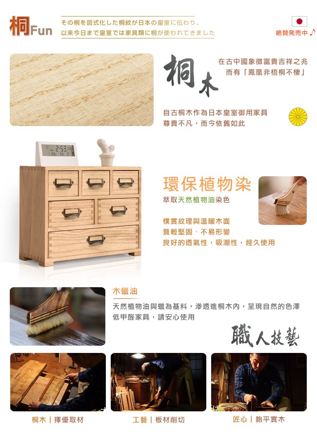 桐木特性重量輕、吸潮、透氣性好、不易變形、結構穩定性強、顏色好看。木材紋理通直,刨光後有絹絲光澤。桐木有很好的象徵意義,象徵富貴,被認為是高級木材之瑰寶。自古以來,是日本皇室御用的傢俱,尊貴不凡,而今依舊如此。