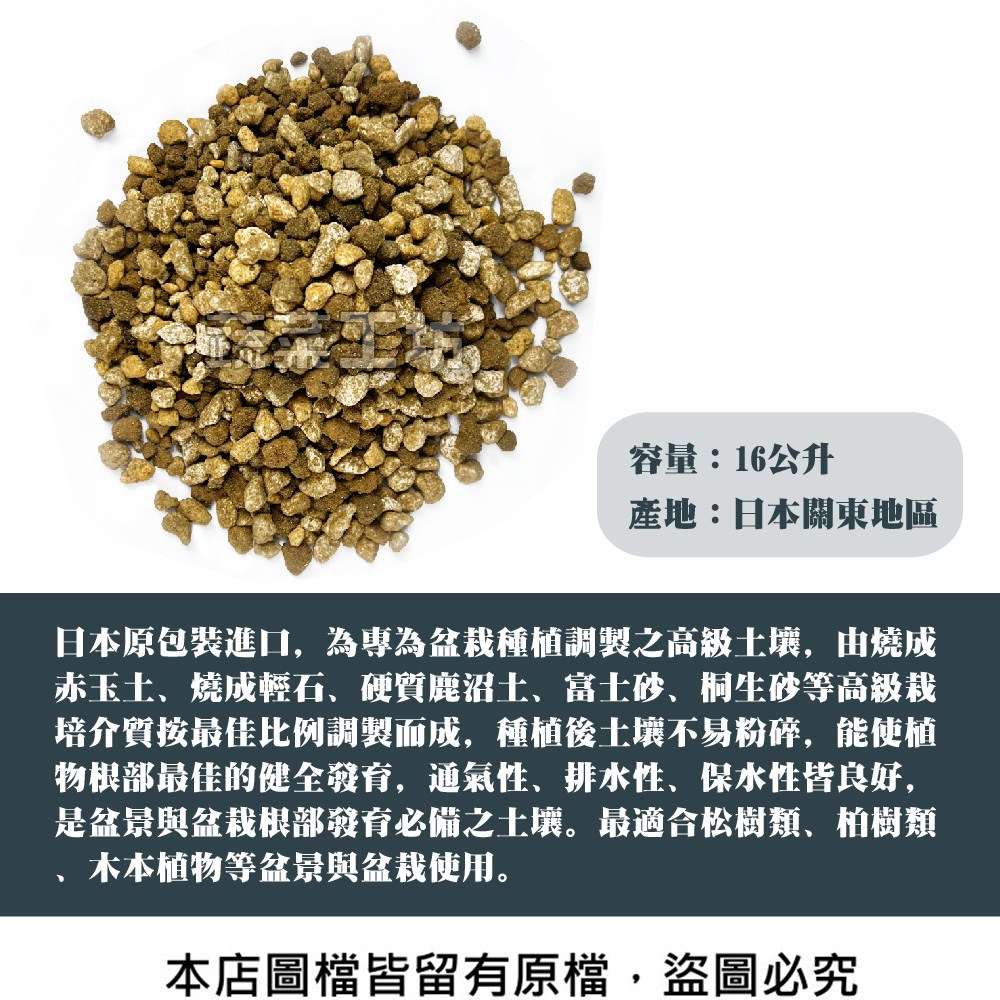 日本原包裝進口,為專為盆栽種植調製之高級土壤,由燒成赤玉土、燒成輕石、硬質鹿沼土、富士砂、桐生砂等高級栽培介質按最佳比例調製而成,種植後土壤不易粉碎,能使植物根部最佳的健全發育,通氣性、排水性、保水性皆良好,是盆景與盆栽根部發育必備之土壤。最適合松樹類、柏樹類、木本植物等盆景與盆栽使用。