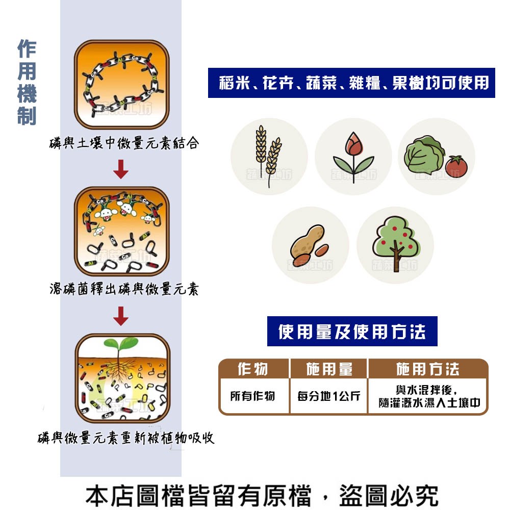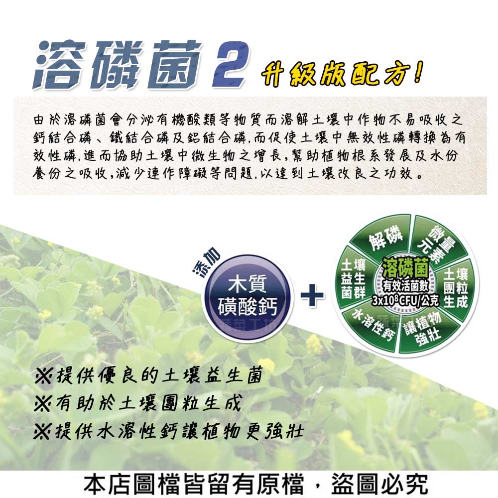 製肥原料:溶磷菌(Bacillus safensis CCA,沙福桿菌)、木質磺酸鈣。