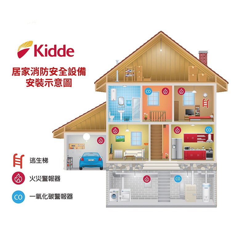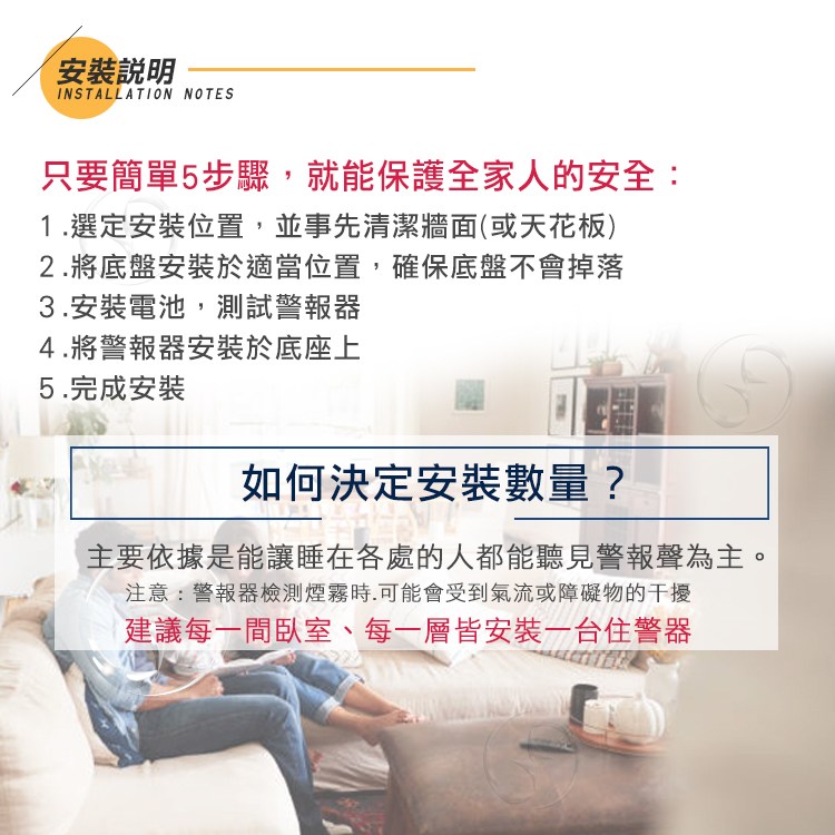 合安裝於臥室、客廳、走廊與樓梯間 廚房請安裝定溫式住警器 建議每一間居室、每一層樓皆安裝一台住警器 警報器檢測煙霧時,可能會受到氣流或障礙物的干擾 安裝數量的依據為,能讓睡在各處的人都能清楚聽見警報聲響