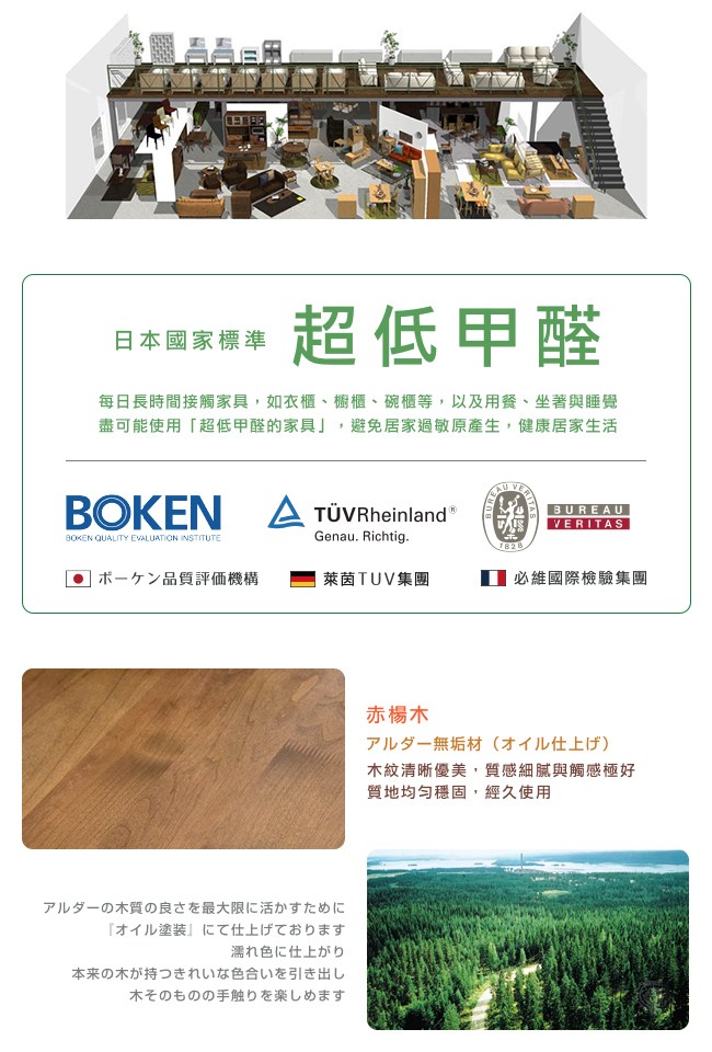 每日長時間接觸家具,如衣櫃、櫥櫃、碗櫃等,以及用餐、坐著與睡覺,盡可能使用「超低甲醛的家具」,避免居家過敏原產生。大丸家具通過日本 BOKEN、德國萊茵 TUV 集團、法國必維國際檢驗集團與多國安全認證,確保每一個家具都是最高品質,符合日本國家標準「超低甲醛」,讓居家環境健康舒適。