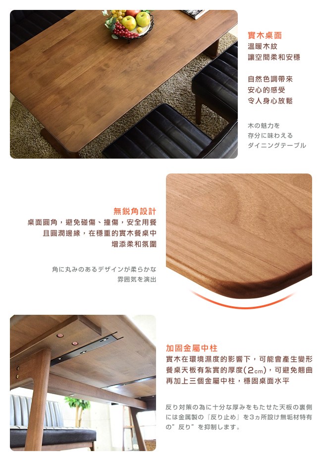 木紋優美的赤楊木餐桌,讓用餐的環境更好,品嚐料理時也增添美味,自然而然讓全家人感受到,實木帶來的安穩氛圍。居家辦公時,寬敞的餐桌沒有拘束感,方便擺放各式各樣的資料,提升效率,專注工作。實木紮實的質地不會凹陷變形,桌下加固金屬中柱,可避免翹曲,穩固桌面水平。桌面收起銳利的直角,圓潤邊緣的安全設計,避免碰傷、撞傷。V型時尚輕盈的橡膠木腳座,增添居家品味,且方便就座與轉向。堅硬的橡膠木為桌腳,結實穩固,經久耐用。