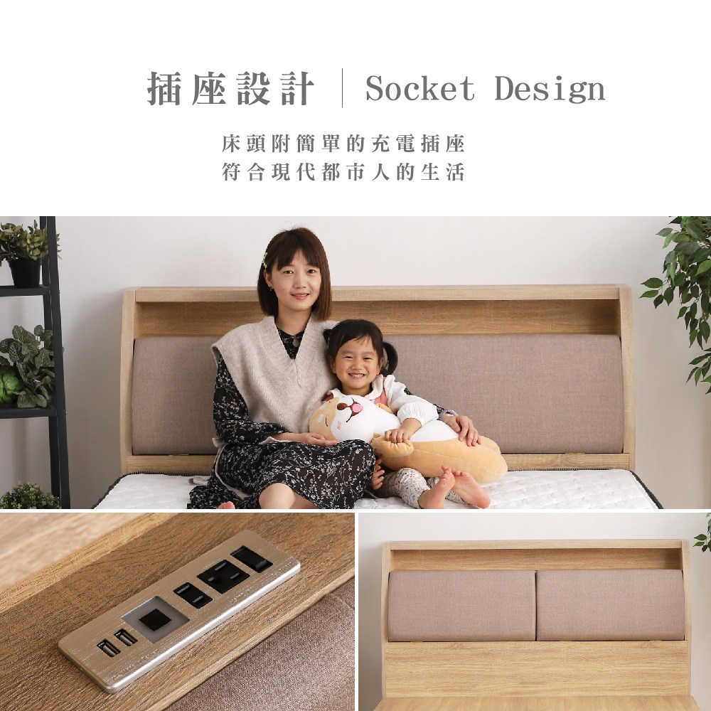 【KIKY】米月可充電收納二件床組 單人加大3.5尺(床頭箱+六分床底)雪松色