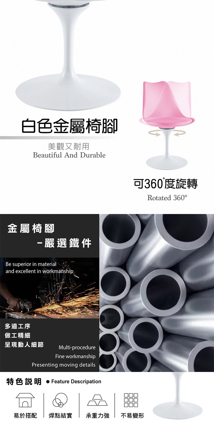 無銳角概念、增加使用的安全性,搭配白色金屬椅腳,美觀又耐用,金屬圓盤腳座可彈性360度旋轉,